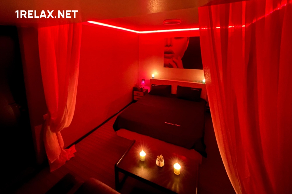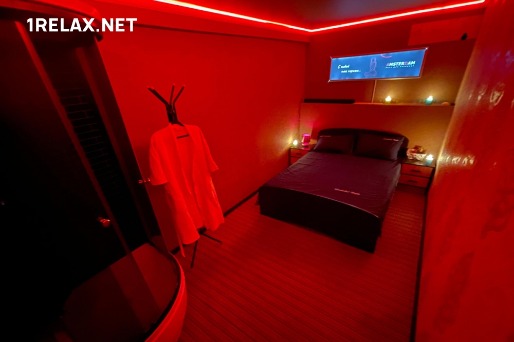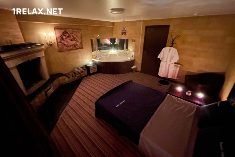 В каждой комнате спа салона есть удобная кровать, диван для отдыха, кондиционер, а также душ или джакузи. Располагающий интерьер, романтичная и таинственная обстановка — все это создает особую атмосферу и помогает расслабиться.