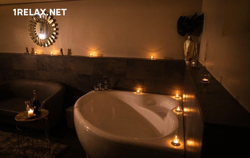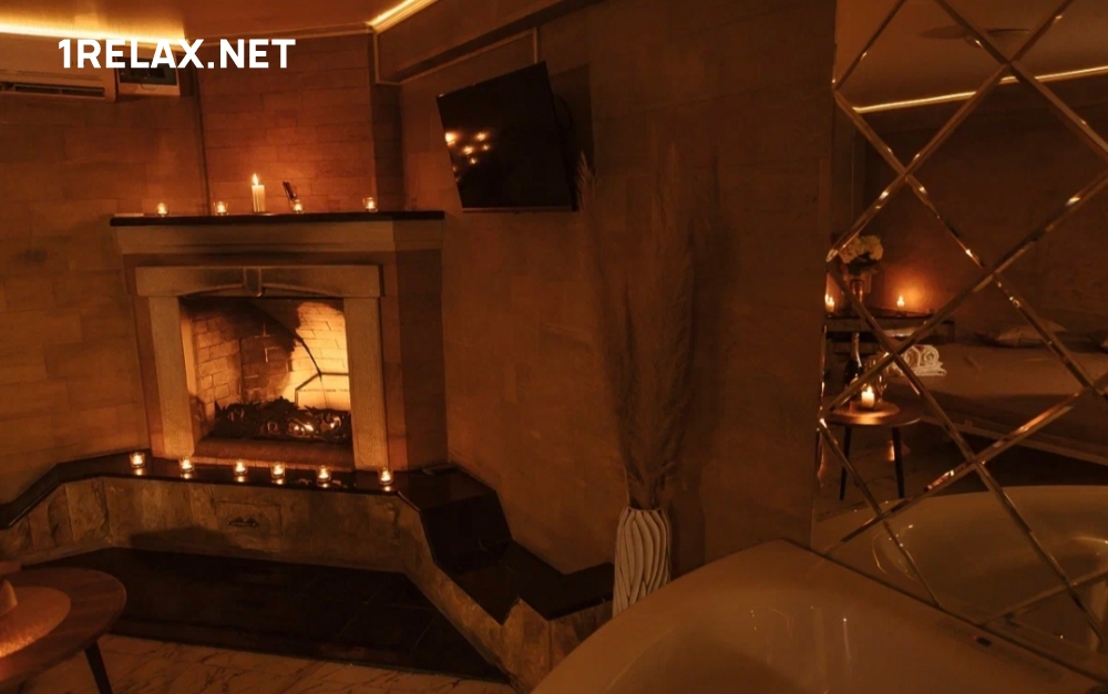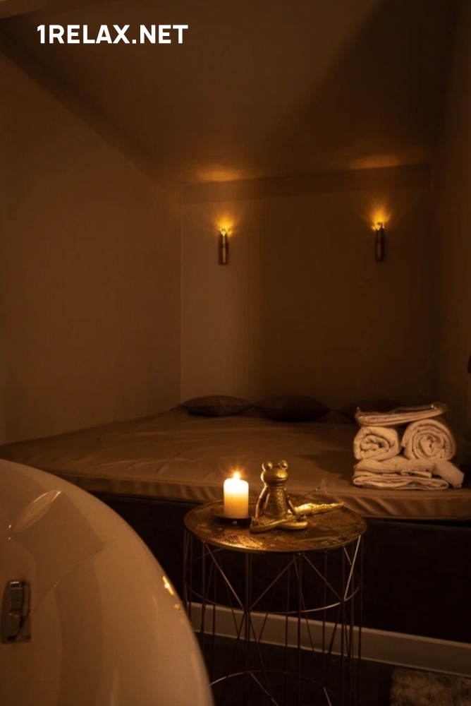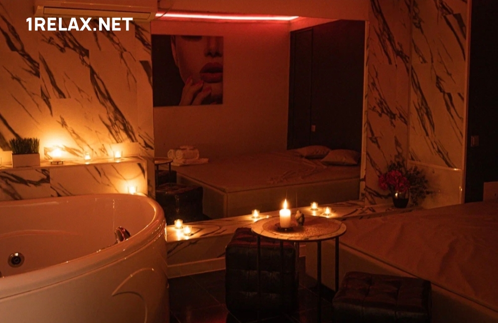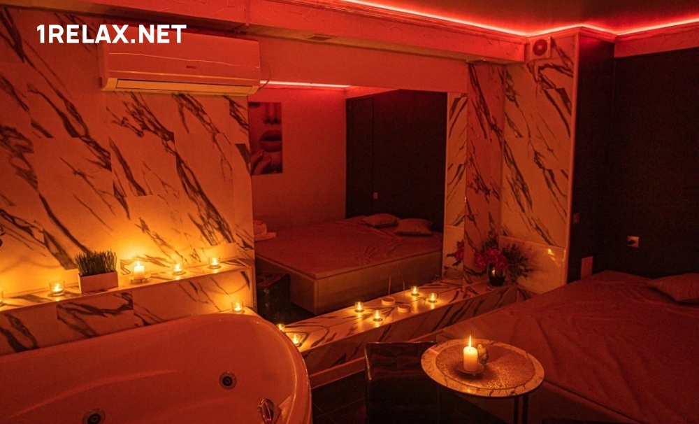 В массажном салоне четыре уютных комнаты. Шикарный интерьер, стильное оформление располагают к безмятежной неге и сладкому удовольствию. В каждой комнате есть татами, джакузи, кондиционер, шест для стриптиза, диван и столик.